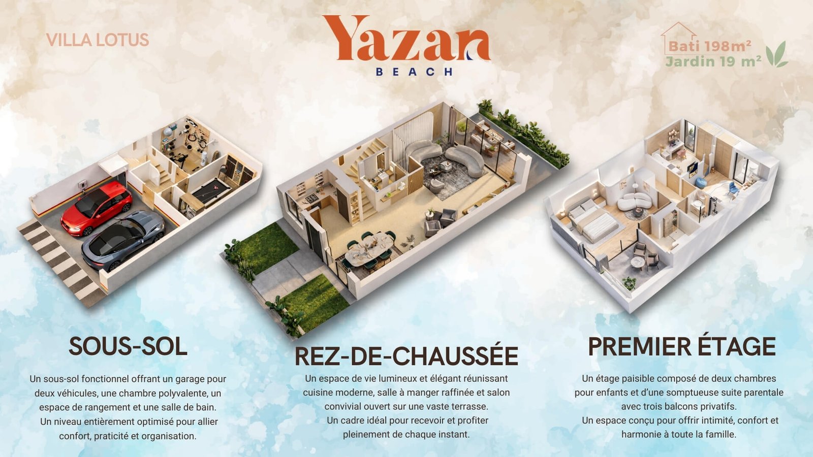 A yazan beach, votre demeure allie prestige, sérénité et confort, elle a été conçue pour répondre à vos justes besoins sans oublier aucun détail, pour combiner tous les styles de vie pour tous les âges et générations, yazan beach est la nouvelle référence des villas de luxe à sidi rahal.